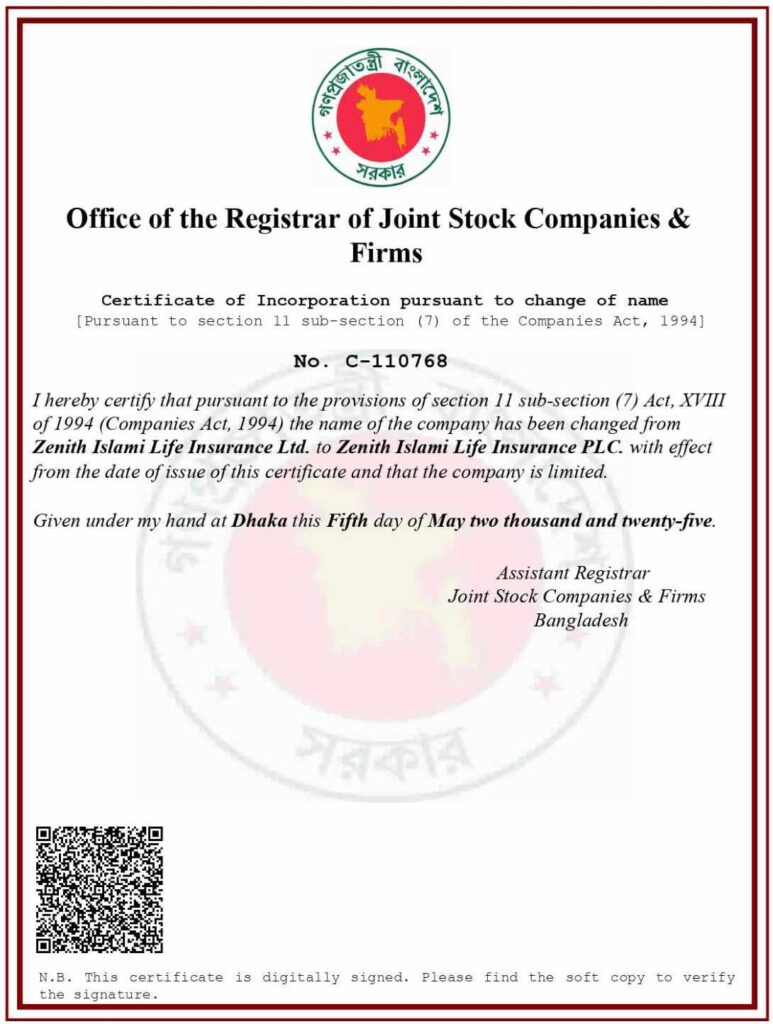 আমাদের কোম্পানির পূর্বের নিবন্ধিত নাম: জেনিথ ইসলামী লাইফ ইন্স্যুরেন্স লিমিটেড (Zenith Islami Life Insurance Limited) পরিবর্তিত হয়ে এখন থেকে হবে বাংলায় জেনিথ ইসলামী লাইফ ইন্স্যুরেন্স পিএলসি এবং ইংরেজীতে(Zenith Islami Life Insurance PLC)। এই নাম পরিবর্তন তাৎক্ষণিকভাবে কর্যকর হয়েছে।