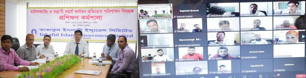 ১৩ মে, ২০২৪ইং সোমবার বিকাল ৪:০০ ঘটিকায় তাকাফুল ইসলামী ইন্স্যুরেন্স লিমিটেড এ মানিলন্ডারিং ও সন্ত্রাসী কার্যে অর্থায়ন প্রতিরোধ পরিপালন বিষয়ক এক প্রশিক্ষণ কর্মশালা ডিজিটাল প্লাটফর্মে অনুষ্ঠিত হয়।
