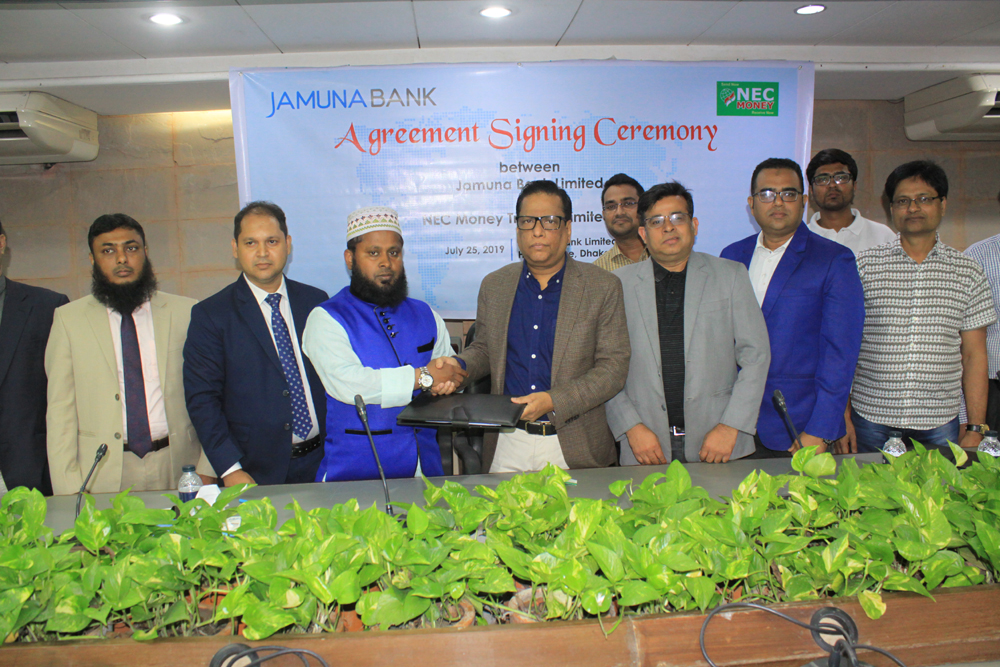 Recently an agreement signing ceremony for Foreign Remittance Services between Jamuna Bank Ltd and NEC Money Transfer Limited, was held at Head Office of Jamuna Bank Limited. Mr. Shafiqul Alam, Managing Director and CEO of the bank & Mr. Ikram Farazy, Chairman & CEO of NEC Money Transfer Limited signed the agreement on behalf of their organizations wherein other high Officials of both the organizations were also present . The beneficiaries will be able to receive their remittances from any Branch of JBL sending through NEC Money Transfer Limited.