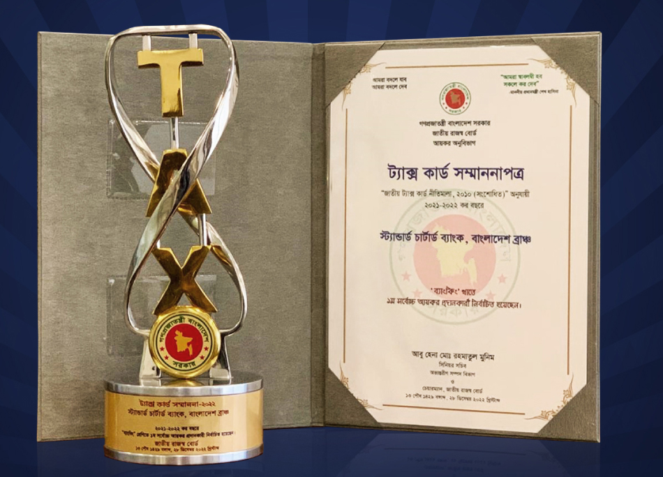 স্ট্যান্ডার্ড চার্টার্ড ব্যাংক (বাংলাদেশ) সম্প্রতি জাতীয় রাজস্ব বোর্ড কর্তৃক ২০২০-২০২১ করবর্ষে ব্যাংকিং বিভাগে সর্বোচ্চ করদাতা হিসাবে স্বীকৃত হয়েছে। বাংলাদেশের কর প্রশাসনের সর্বোচ্চ কর্তৃপক্ষ হিসেবে এনবিআর, দেশের উন্নয়নে মডেল করদাতাদের অসামান্য অবদানের জন্য ঢাকায় এক অনুষ্ঠানে শীর্ষ করদাতা হিসেবে ১৪১ জন ব্যক্তি ও কোম্পানিকে ট্যাক্স কার্ড হস্তান্তর করেছে। স্ট্যান্ডার্ড চার্টার্ড বাংলাদেশের কনজিউমার, প্রাইভেট অ্যান্ড বিজনেস ব্যাংকিং বিভাগের প্রধান সাব্বির আহমেদ ব্যাংকের পক্ষে পুরস্কার গ্রহণ করেন।