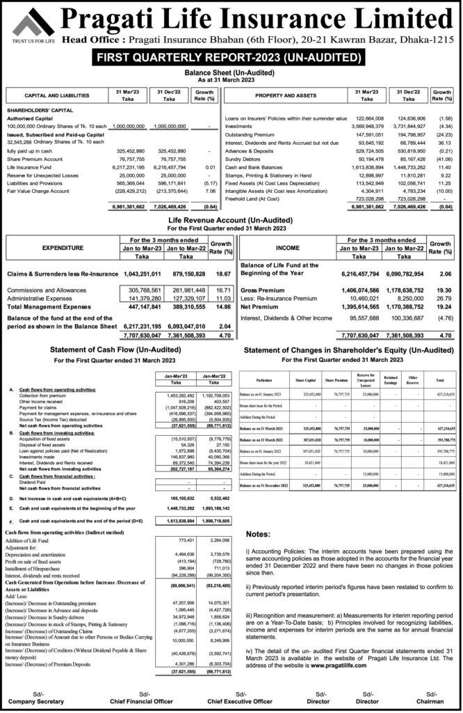 ইন্সুরেন্স Financial Report Pragati Life Insurance Limited First Quarter 2023. July 2, 2023 Share on Facebook Tweet on Twitter tweet Financial Report Pragati Life Insurance Limited First Quarter 2023.