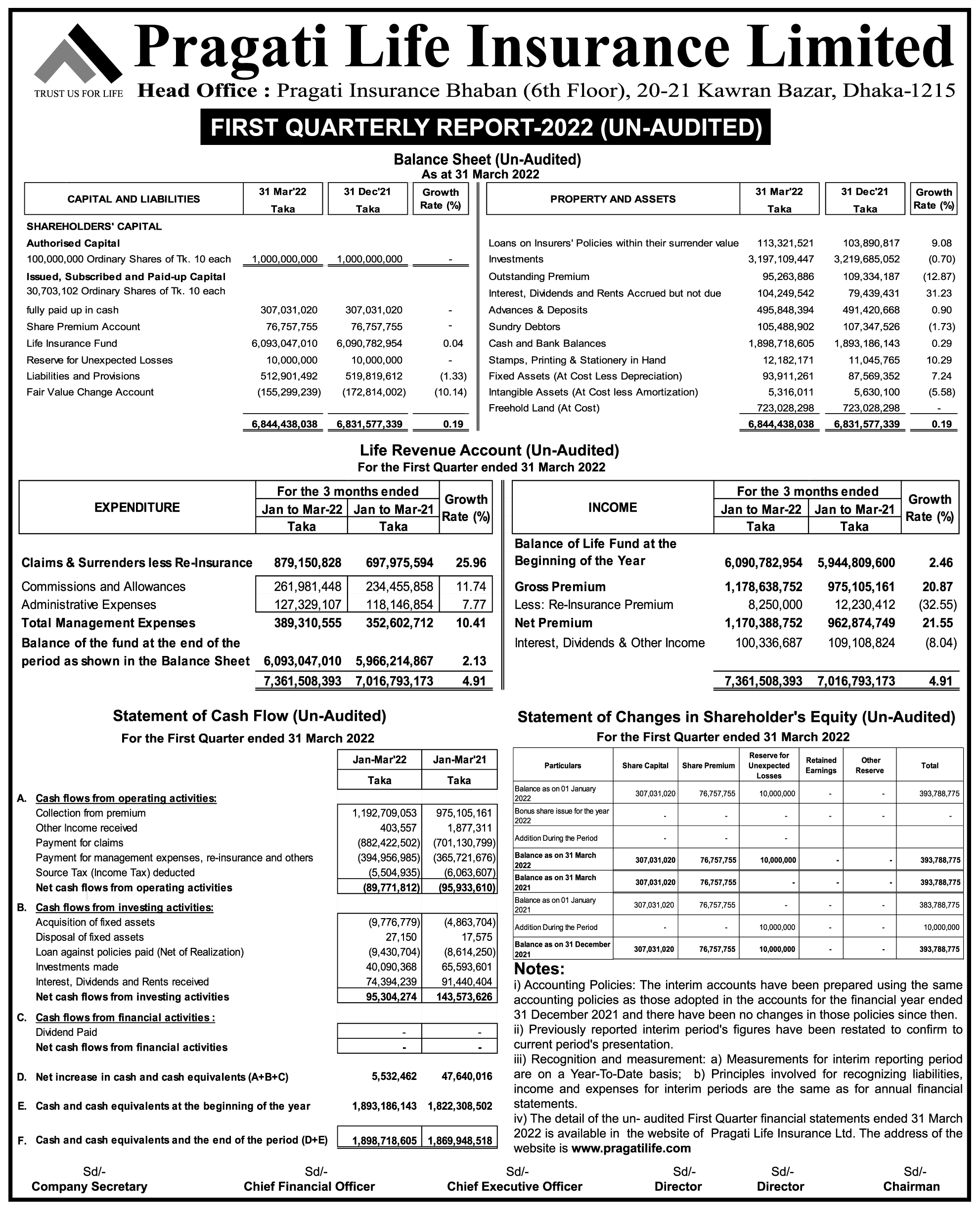 Pragati Life Insurance ltd.First Quarterly Report-2022. (Un-audited)