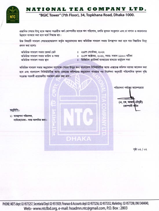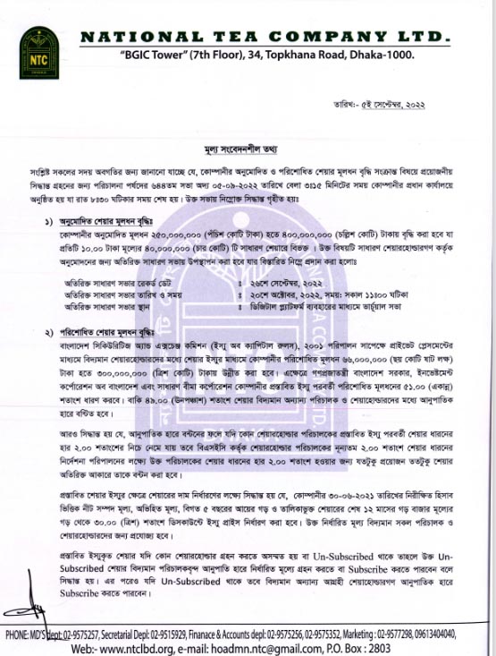 পিএসআই নিউজ Price Sensitive Information National Tea Company Ltd. September 5, 2022 Share on Facebook Tweet on Twitter tweet Price Sensitive Information National Tea Company Ltd.