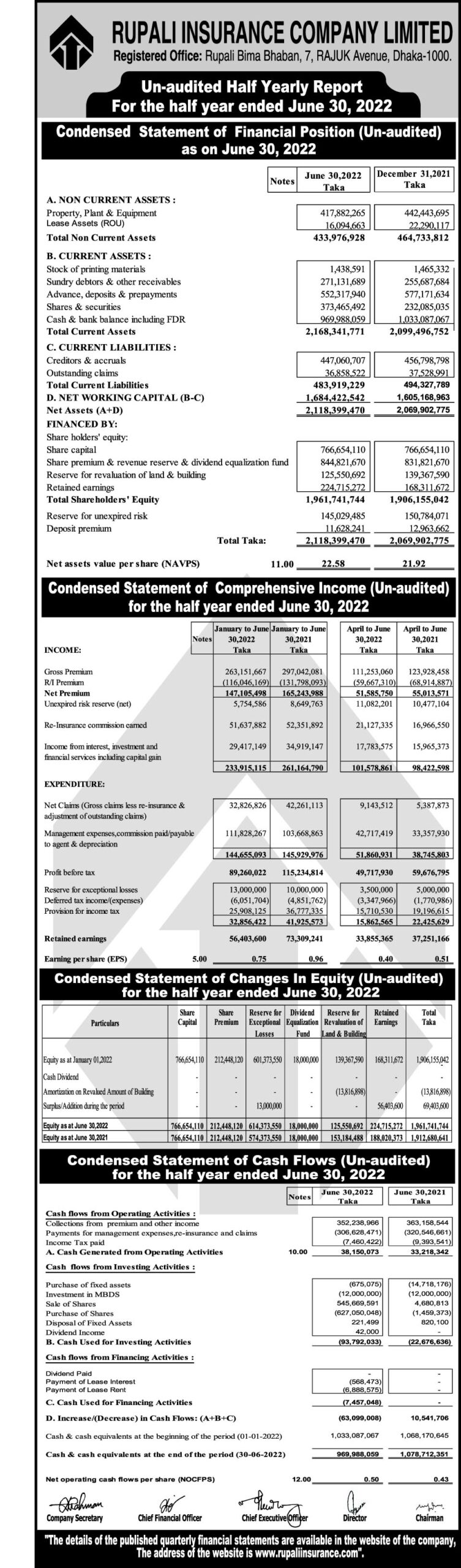 Rupali Insurance Company Ltd Half Yearly Report July-2022. (Un-audited)