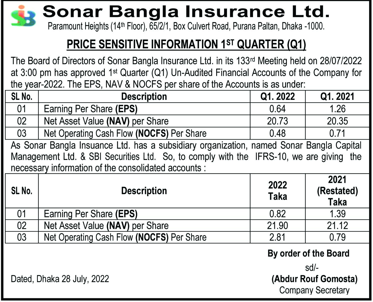 Sonar Bangla Insurance Limited. PSI (1st Quarter)