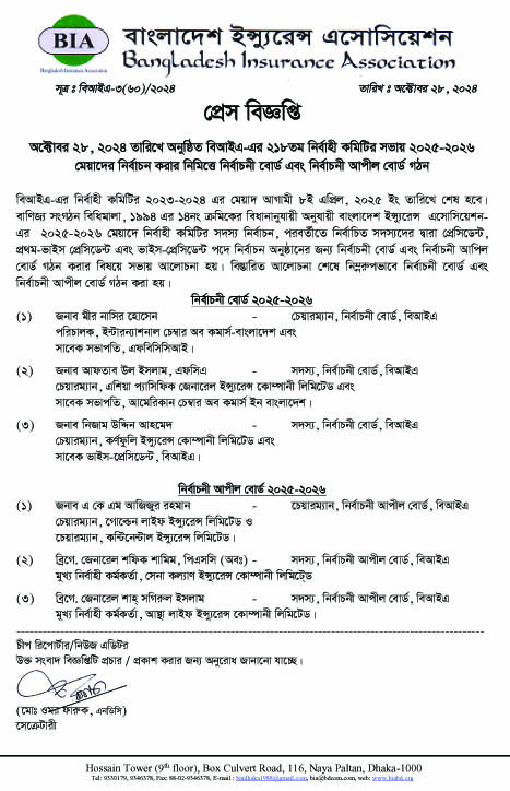 ইন্সুরেন্স অক্টোবর ২৮, ২০২৪ তারিখে অনুষ্ঠিত বিআইএ-এর ২১৮তম নির্বাহী কমিটির সভায় ২০২৫-২০২৬ মেয়াদের নির্বাচন করার নিমিত্তে নির্বাচনী বোর্ড এবং নির্বাচনী আপীল বোর্ড গঠন October 28, 2024 Share on Facebook Tweet on Twitter tweet