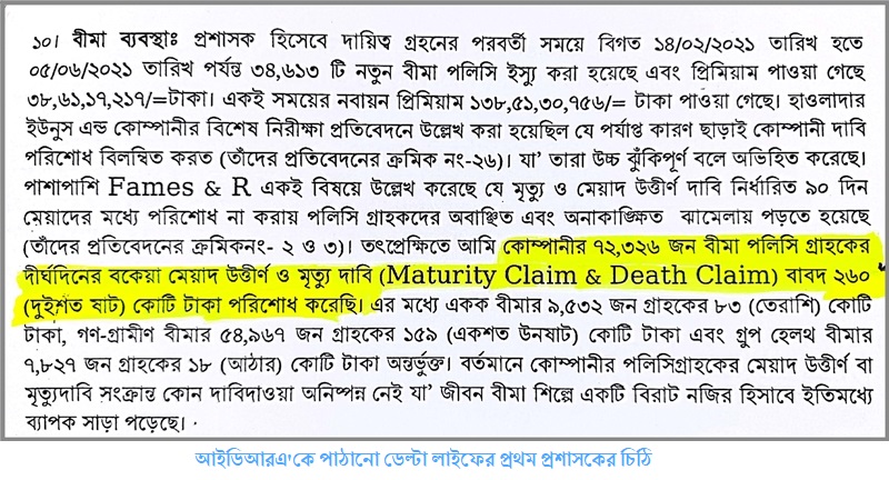 তবে, ১০ ফেব্রুয়ারি ২০২১ সাল পর্যন্ত ডেল্টা লাইফে ১৩৮ কোটি টাকার মেয়াদ উত্তীর্ণ দাবি ও মৃত্যুদাবি দীর্ঘদিন বকেয়া রাখা হয়েছিল বলে উল্লেখ করা হয় অভ্যন্তরীন নিরীক্ষার অন্তবর্তীকালীন প্রতিবেদনে। অভ্যন্তরীন এ নিরীক্ষা করেন প্রথম প্রশাসক সুলতান-উল আবেদীন মোল্লা। ফলে ২ হাজার ৫১৩ কোটি টাকার মেয়াদ উত্তীর্ণ বীমা দাবি পরিশোধ না করে লাইফ ফান্ড ও সারপ্লাস বাড়িয়ে নগদ লভ্যাংশ নেয়ার মাধ্যমে আর্থিক ক্ষতির যে কথা বলা হয়েছে তা নিয়ে প্রশ্ন দেখা দিয়েছে।