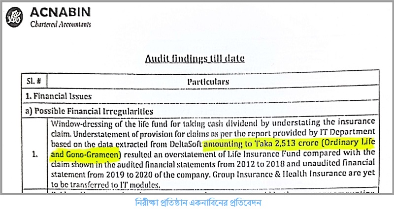 এতে দেখা যায়, প্রতিবেদনটির ৭০টি অডিট আপত্তির সম্ভাব্য অনিয়মের ১ নং এ বলা হয়, পরিচালকরা নগদ লভ্যাংশ নিতে উইন্ডো ড্রেসিং করে ২ হাজার ৫১৩ কোটি টাকার মেয়াদ উত্তীর্ণ দাবি পরিশোধ না করে লাইফ ফান্ড বাড়িয়েছে। মেয়াদ উত্তীর্ণ দাবি পরিশোধ সংক্রান্ত কোম্পানির আর্থিক প্রতিবেদনের তথ্যের সঙ্গে কোম্পানির কম্পিউটার ডাটাবেজে সংরক্ষিত তথ্য পরীক্ষা করে লাইফ ফান্ড বাড়ানোর এমন চিত্র পেয়েছে নিরীক্ষক প্রতিষ্ঠান একনাবিন।