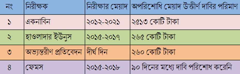 তবে আর্থিক ক্ষতির এমন চিত্রের কোনো বিস্তারিত তথ্য উপস্থাপন করা হয়নি ৭৪ পৃষ্ঠার ওই প্রতিবেদনে। আবার ২ হাজার ৫১৩ কোটি টাকার মধ্যে কোন বছরে কত টাকার মেয়াদ উত্তীর্ণ দাবি কম দেখানো হয়েছে তারও কোন পরিসংখ্যান দেয়া হয় নাই।