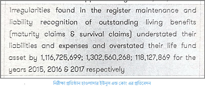 প্রতিবেদনটির ৫৪ ও ৫৬ নং পৃষ্ঠার ৩(ই) ১ এর (II) অনুচ্ছেদে বলা হয়েছে, মেয়াদ উত্তীর্ণ দাবি, মৃত্যুদাবি, সারভাইবাল বেনিফিট, পলিসি বোনাস ও অন্যান্য সহ সর্বমোট ২৫৬ কোটি ১৪ লাখ টাকা কম দেখানো হয়েছে। এর মধ্যে মেয়াদ উত্তীর্ণ দাবি কম দেখানো হয়েছে, ২৫৩ কোটি ৭৪ লাখ ১৩ হাজার ৮৩৫ টাকা। মৃত্যুদাবি কম দেখানো হয়েছে ২ কোটি ৩৯ লাখ ৮০ হাজার টাকা। নিরীক্ষক প্রতিষ্ঠান ২০১৫ থেকে ২০১৭ সাল ৩ বছরের কোম্পানির ব্যবসায়ীক কর্মকাণ্ড তদন্ত করে বিশেষ নিরীক্ষা প্রতিবেদন দাখিল করেন।