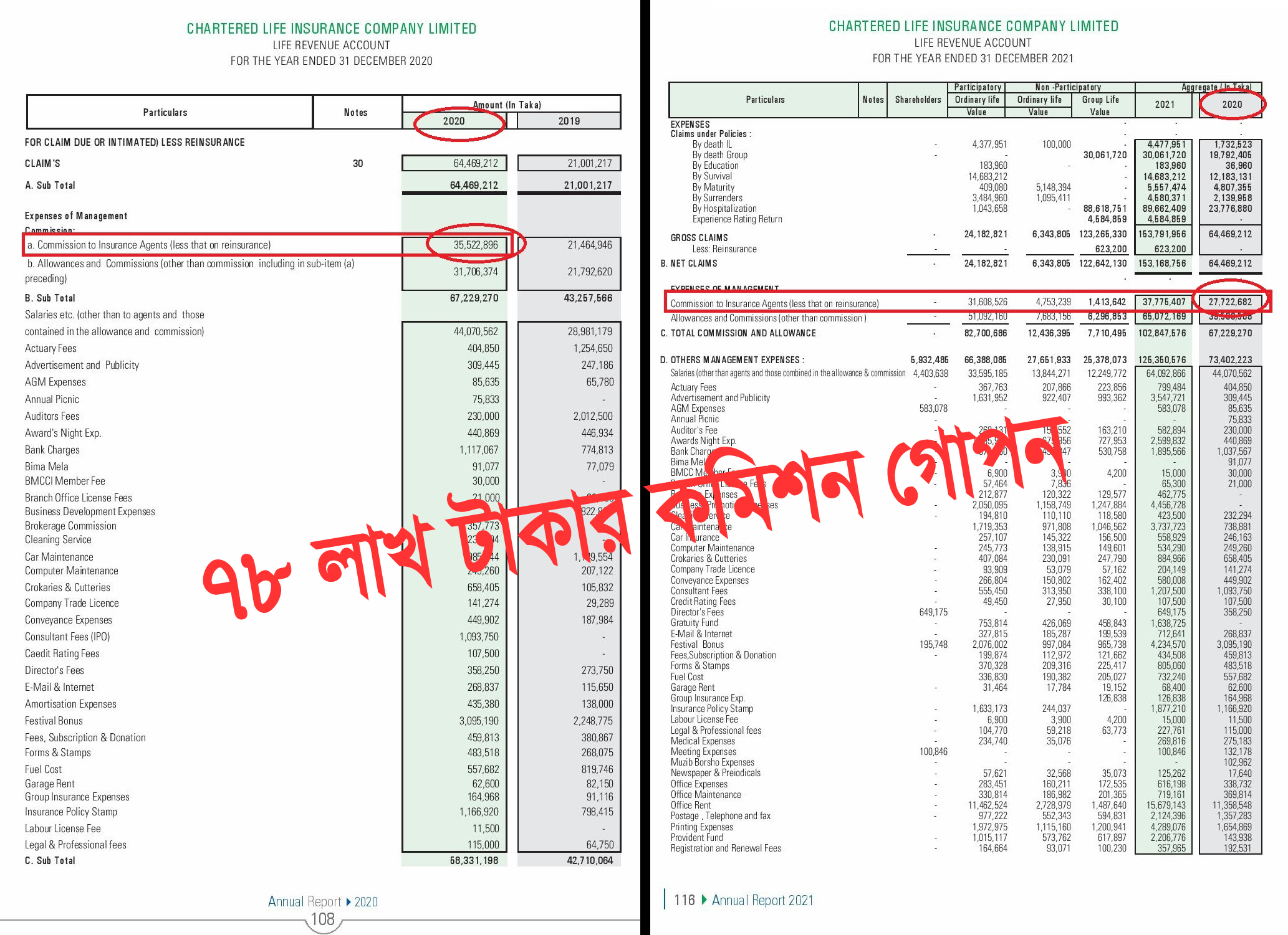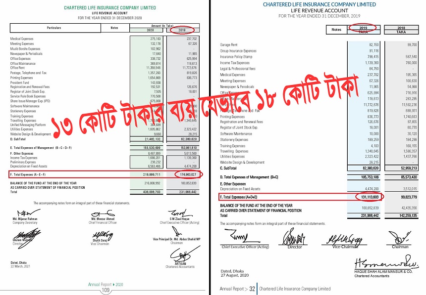 অন্যদিকে ২০২০ সালের আর্থিক প্রতিবেদনে ২০১৯ সালের মোট খরচে দেখানো হয়েছে- ২ কোটি ১০ লাখ টাকার বীমা দাবি, মোট ব্যবস্থাপনা ব্যয় ১৫ কোটি ৪০ লাখ টাকা (৪ কোটি ৩৩ লাখ টাকা কমিশন, ব্যবস্থাপনা ব্যয়ের দু’টি হেডে ৪ কোটি ২৭ লাখ টাকা ও ৬ কোটি ২৪ লাখ টাকা) এবং অন্যান্য ব্যয় ৫৬ লাখ টাকা।