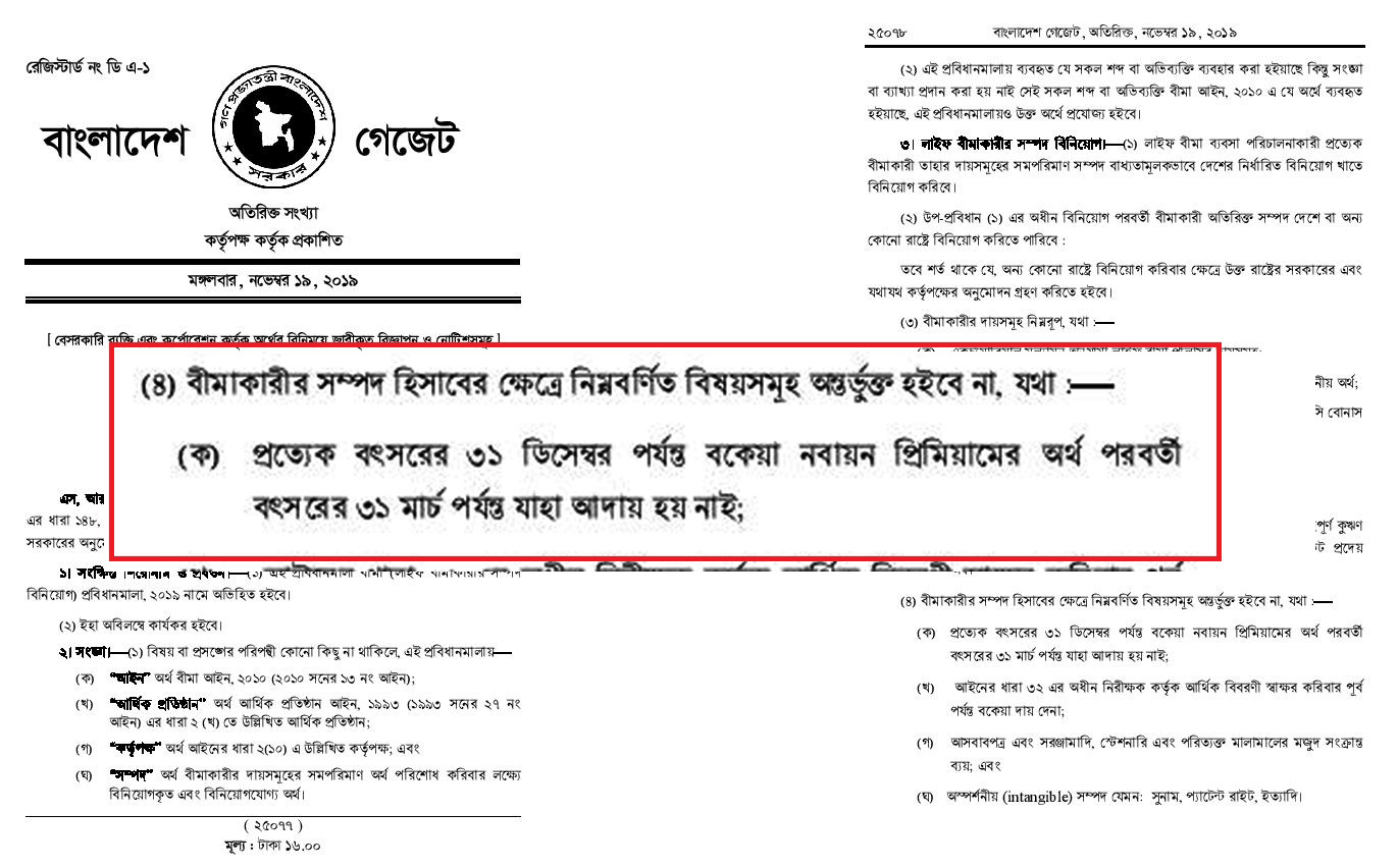 অথচ আইন অনুসারে বকেয়া প্রিমিয়ামকে সম্পদ হিসেবে দেখানোর সুযোগ নেই। আইনে বলা হয়েছে, প্রত্যেক বছর ৩১ ডিসেম্বর পর্যন্ত বকেয়া নবায়ন প্রিমিয়াম পরের বছরের ৩১ মার্চের মধ্যে আদায় না হলে তা সম্পদে অর্ন্তভু্ক্ত হবে না।
