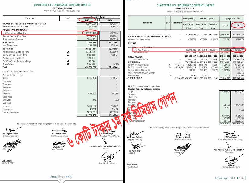 ২০২০ সালের ১৬ কোটি ১২ লাখ টাকার ১ম বর্ষ প্রিমিয়াম সংগ্রহের হিসাবটি পরের বছর ২০২১ সালের আর্থিক প্রতিবেদনে হয়ে গেছে ১০ কোটি ৫৫ লাখ টাকা। আবার গ্রুপ ও হেলথ ইন্স্যুরেন্স পলিসির ৫ কোটি ৮৮ লাখ টাকার প্রিমিয়াম সংগ্রহের হিসাবটি পুরোটাই মুছে দেয়া হয় ২০২১ সালের আর্থিক প্রতিবেদন থেকে।