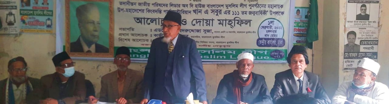 পাকিস্তান জাতীয় পরিষদের সাবেক সংসদ নেতা ও কেন্দ্রীয় যোগাযোগ মন্ত্রী এবং বাংলাদেশ মুসলিম লীগের সভাপতি খান এ সবুর এর ১১১ তম জন্মবার্ষিকী উপলক্ষে দলের কেন্দ্রীয় কার্যালয়ে দলীয় সভাপতি সাবেক সংসদ সদস্য এডভোকেট বদরুদ্দোজা সুজার সভাপতিত্বে অনুষ্ঠিত আলোচনা সভা ও দোয়া মাহফিলে দলীয় নেতৃবৃন্দ উপরোক্ত মন্তব্য করেন। আরও বক্তব্য রাখেন দলের মহাসচিব কাজী আবুল খায়ের, স্থায়ী কমিটির সিনিয়র সদস্য আতিকুল ইসলাম ও আনোয়ার হোসেন আবুড়ী, সহ-সভাপতি নজরুল ইসলাম, অতিরিক্ত মহাসচিব আকবর হোসেন পাঠান, সাংগঠনিক সম্পাদক এস এইচ খান আসাদ, প্রচার সম্পাদক শেখ আব্দুস সবুর, কেন্দ্রীয় নেতা এ্যাড হাবিবুর রহমান, মুসলিম ছাত্রলীগের সভাপতি নুরে আলম প্রমুখ।