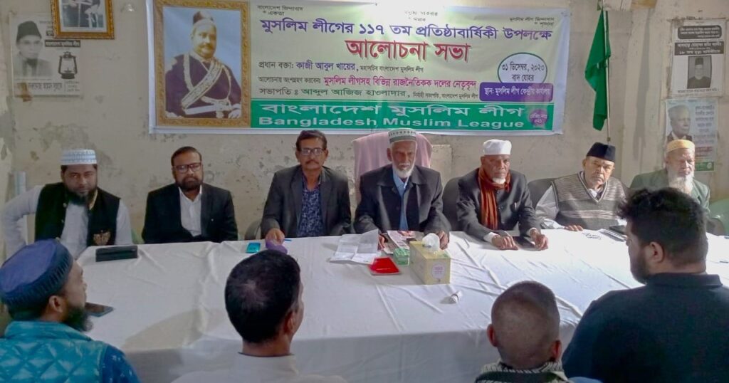 ৩১ ডিসেম্বর, ২০২৩বাদ যোহর উপমহাদেশের প্রাচীনতম রাজনৈতিক দল মুসলিম লীগের ১১৭তম প্রতিষ্ঠাবার্ষিকী উপলক্ষে বাংলাদেশ মুসলিম লীগের আয়োজনে দলের কেন্দ্রীয় কার্যালয়ে, নির্বাহী সভাপতি আব্দুল আজিজ হাওলাদারের সভাপতিত্বে অনুষ্ঠিত আলোচনা সভায় নেতৃবৃন্দ উপরোক্ত মন্তব্য করেন। আরো বক্তব্য রাখেন মুসলিম লীগ মহাসচিব কাজী আবুল খায়ের, স্থায়ী কমিটির সদস্য আনোয়ার হোসেন আবুড়ী, সহ-সভাপতি নজরুল ইসলাম, দফ্তর সম্পাদক খোন্দকার জিল্লুর রহমান, এ্যাড. হাবিবুর রহমান, এ্যাড. আফতাব হোসেন মোল্লা ও সৈয়দ আব্দুল হান্নান নূর, অতিরিক্ত মহাসচিব কাজী এ.এ কাফী, সহ সাংগঠনিক সম্পাদক মাহবুবুর রহমান ভূঁইয়া, কেন্দ্রীয় নেতা ইঞ্জি: ওসমান গনী, নুরুজ্জামান বাছার, মোঃ নূর আলম প্রমুখ।