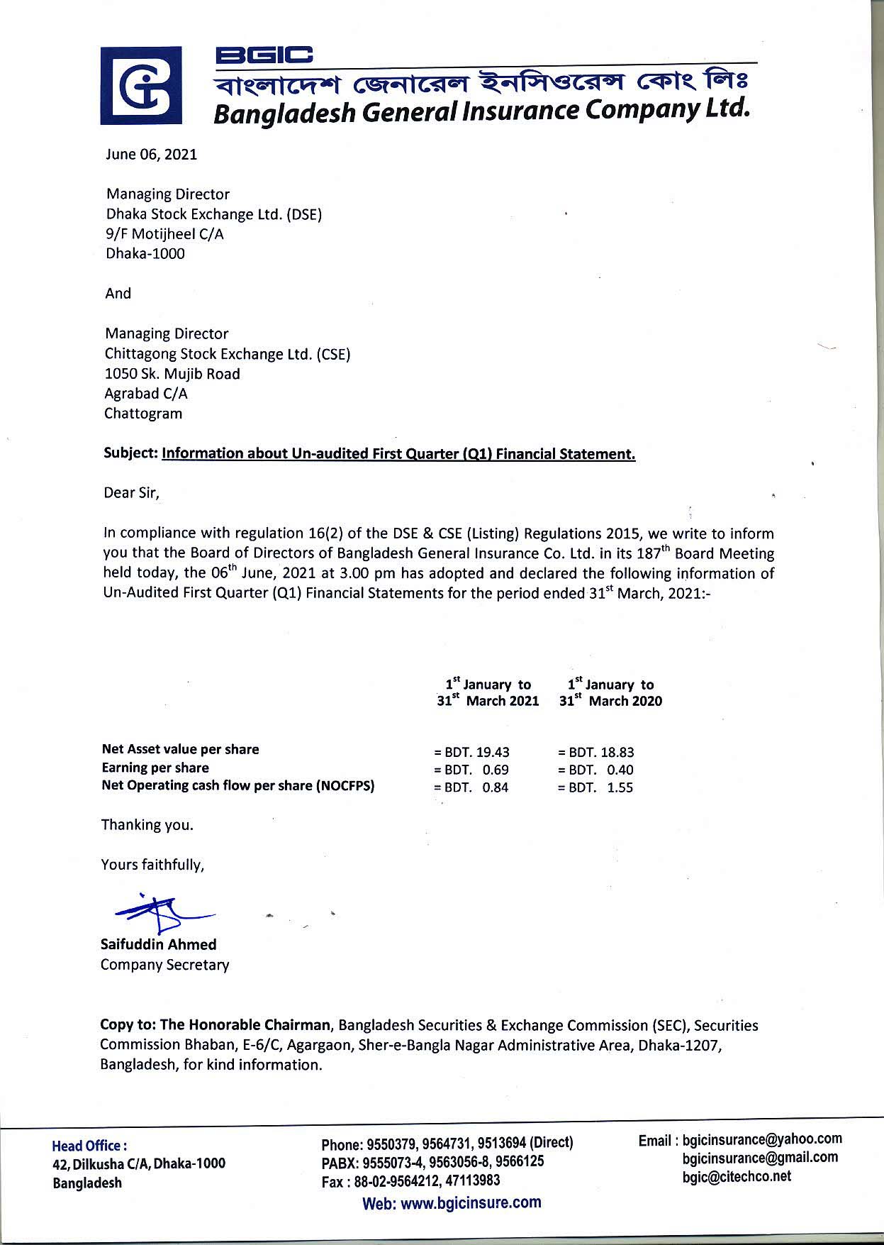 পিএসআই নিউজ Bangladesh General Insurance Company Ltd. PSI News June 6, 2021 Share on Facebook Tweet on Twitter tweet BGIC Un-audited First Quarter (Q1) Financial Statement.