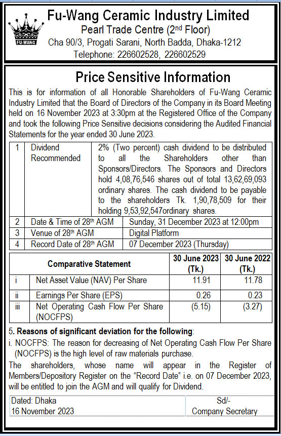 পিএসআই নিউজ Fu-Wang Ceramic Industry Limited Price Sensitive Information November 16, 2023 Share on Facebook Tweet on Twitter tweet Fu-Wang Ceramic Industry Limited Price Sensitive Information