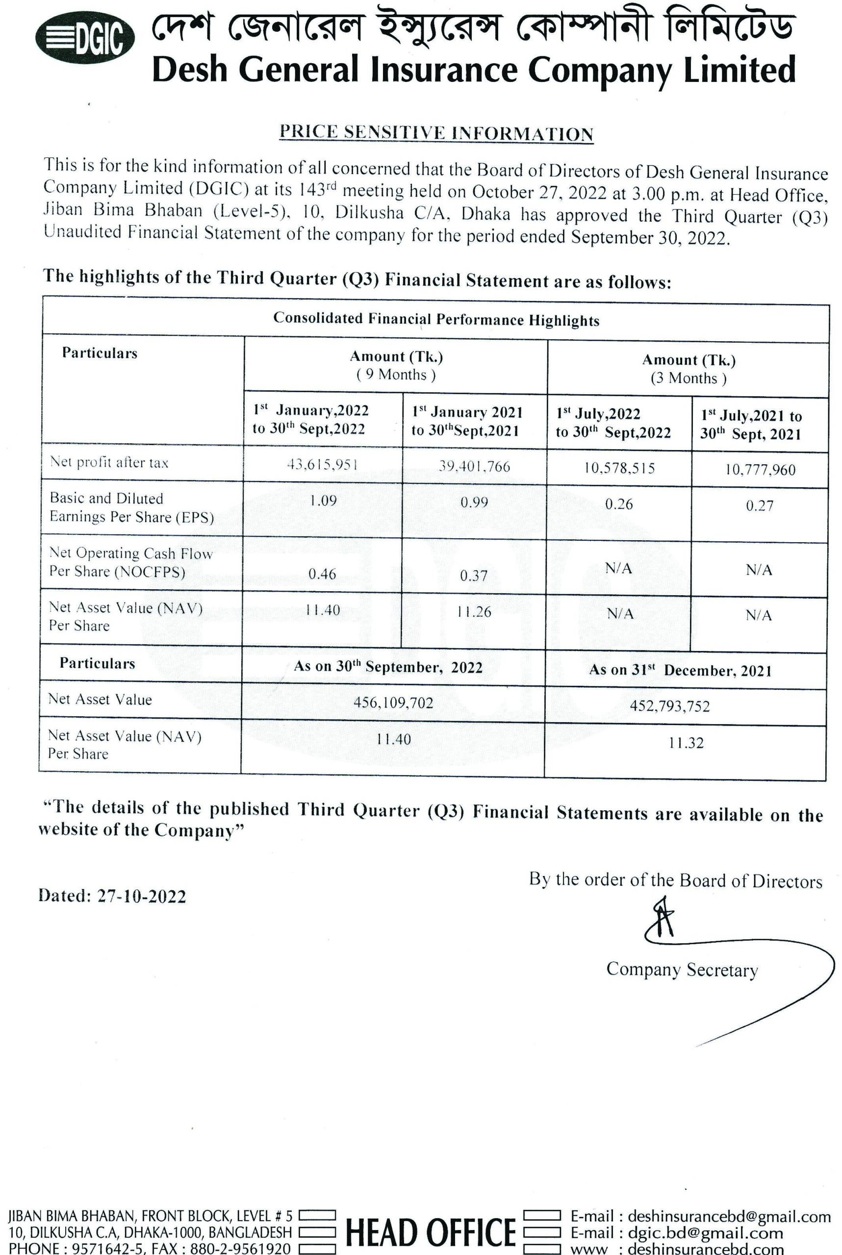 পিএসআই নিউজ PRICE SENSITIVE INFORMATION OF DGIC THIRD QUARTER October 27, 2022 Share on Facebook Tweet on Twitter tweet PRICE SENSITIVE INFORMATION OF DGIC THIRD QUARTER